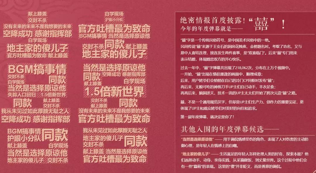 这是B站第二次发布年度弹幕了,在去年,登顶年度弹幕的是刷cp必备的弹幕:“囍”,2017年一年的发送次数是218062次,从数据上来看,短短一年时间,B站用户刷弹幕的战斗力,又有了一次明显的提升。