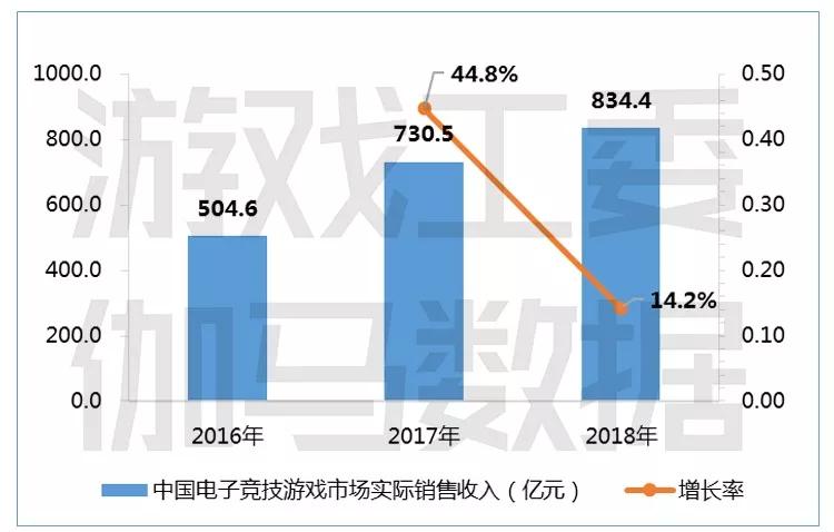 2018年中国电子竞技游戏市场实际销售收入达834.4亿元,同比增长14.2%。