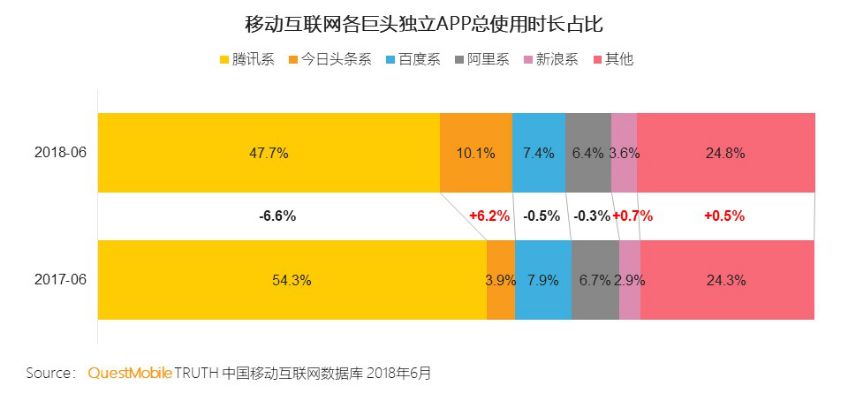 QuestleMobile 数据显示,2018 年上半年期间,腾讯系产品使用时长由 54.3% 下降至 47.7%,共下降 6.6%;同时,头条系产品使用时长由 3.9% 增至 10.1%,增长 6.2%,可以看到腾讯系产品流失的时长很大一部分转移到了头条系产品中。这也是「头腾大战」持续不断的原因。