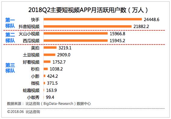比达数据显示,2018 年 Q2 短视频 APP 月活排名中,头条系产品中抖音排在第一梯队,火山小视频、西瓜视频排在第二梯队中;而腾讯系产品仅有微视上榜。