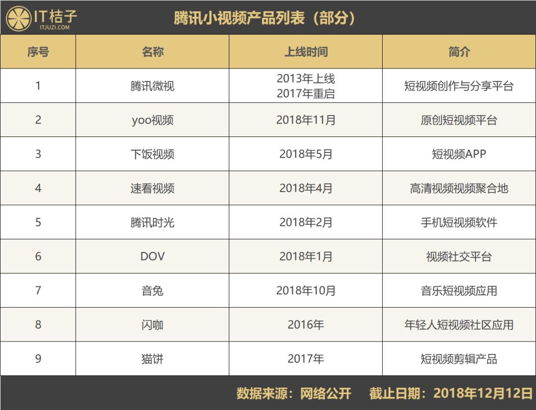 IT 桔子统计显示,截止 2018 年 12 月 12 日,头条共发布四款小视频产品,分别是:西瓜视频、火山小视频以及抖音,还有快拍腾讯方面,共计发布 9+款小视频产品:腾讯微视、yoo 视频、下饭视频、速看、腾讯时光、DOV、音兔、闪咖、猫饼……