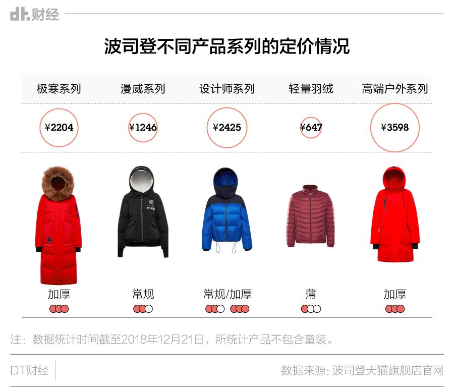 DT君则观察到,波司登一鼓作气推出了多个高端系列:旗下的极寒系列、设计师系列和Gore-tex高端户外系列,分别对应通勤、城市、户外等不同的穿搭场景。其中定价最高的是高端户外系列,系列产品采用防水防风且透气的专业面料和品质更胜的灰鹅绒,产品均价达到3598元。