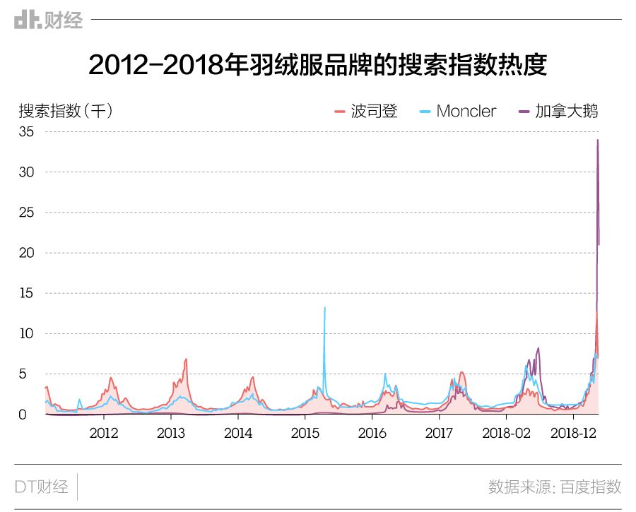 人们对于加拿大鹅的关注最早起于2015年至2016年的冬天,在2017年末到2018年初超过波司登和Moncler,成为最受关注的羽绒服品牌。