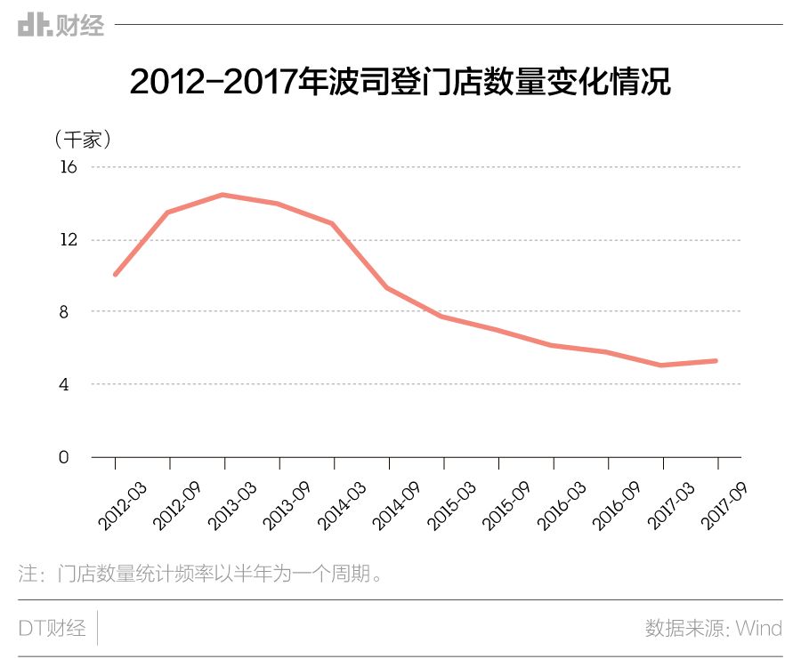 对比鲜明的是,处在转型期的老牌国货看起来有些不得志。2013年初,波司登的线下门店多达14000多家,之后的两年间,这个数量降至7600多。