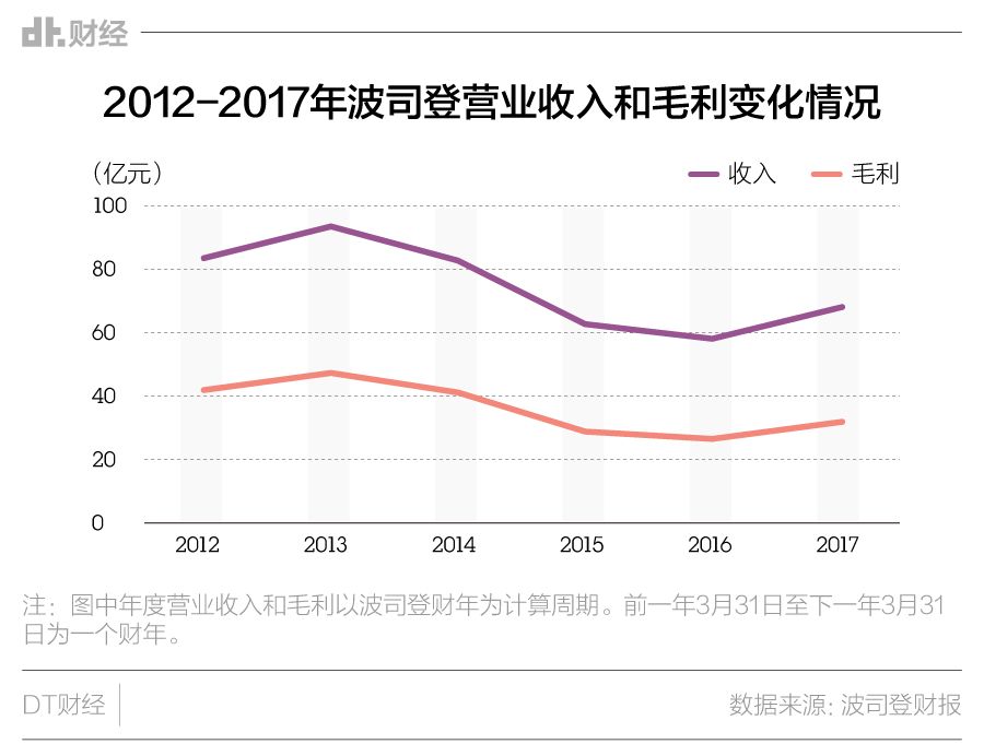 随着门店数量下降的,还有波司登在财报中的收入和毛利数字,在2013年取得93.2亿元的收入和47.2亿元的毛利后,接下来三年一路下降。