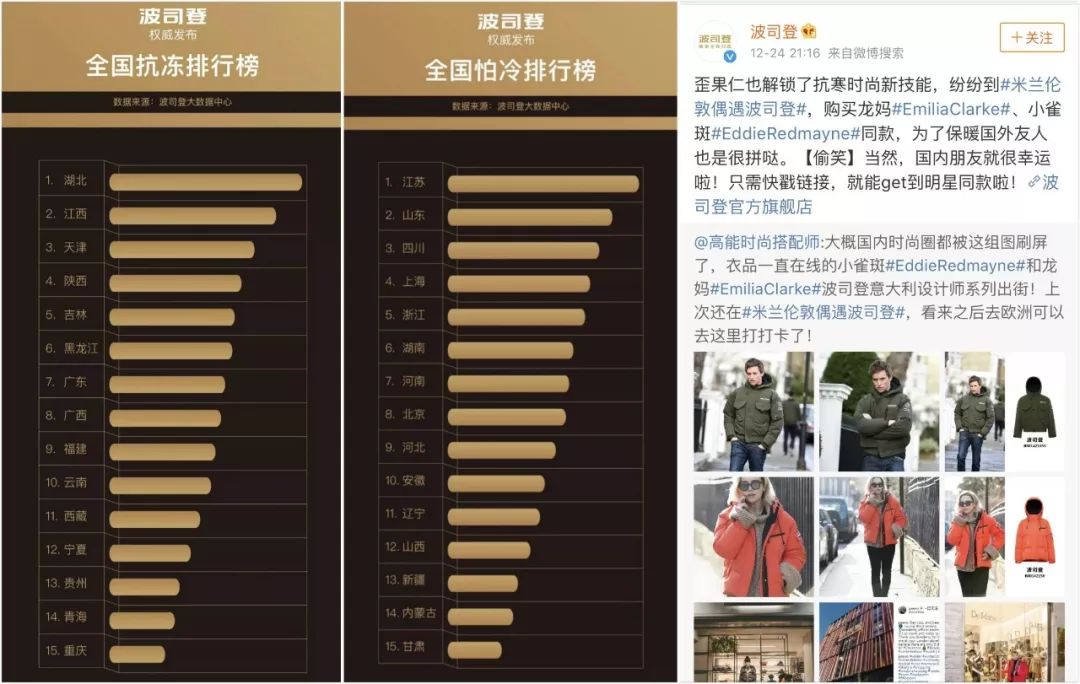在这样一个全新的消费升级时代,波司登学会了紧跟潮流,一会儿推出全国怕冷、抗冻排行榜,一会儿宣传明星纷纷上身自家羽绒服,大玩营销,成功圈了一波粉。