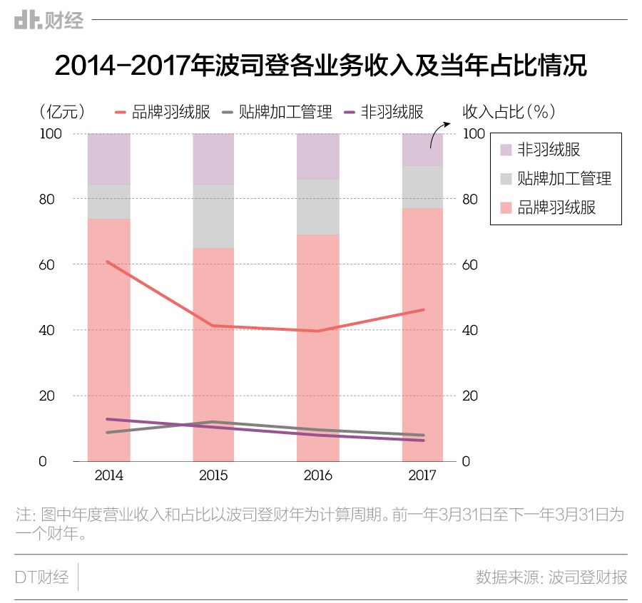 聚焦羽绒服的效果在财报里也得到体现。2017财年,波司登品牌羽绒服的收入占比上升到76.6%,羽绒服业务收入上涨15%。这一时期,集团整体收入和毛利也开始上升。