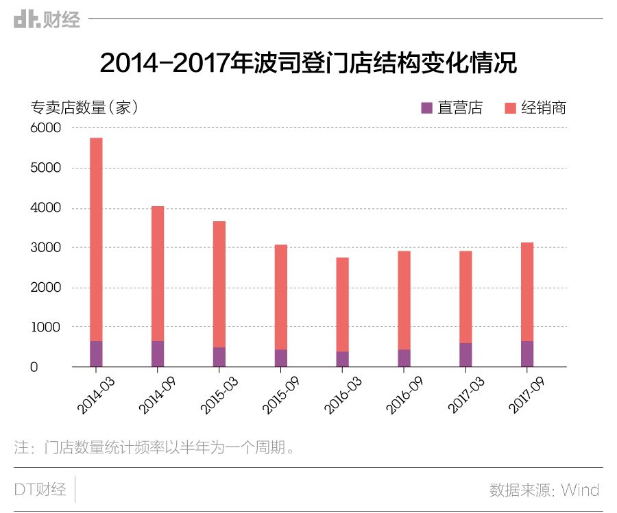 我们发现,2014年以来波司登关闭的线下专卖店,大多是包括加盟在内的经销商门店。从业绩开始有回暖趋势的2016年下半年开始,经销商门店的数量仍在不断调整,而直营店一直维持着稳定的增长。