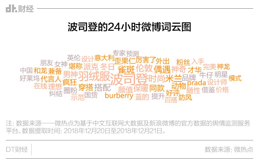 DT君顺手查看了近期某天围绕波司登展开的微博讨论,“时尚”出现频率极高,“意大利”、“好莱坞”、“米兰”等词也挺显眼。