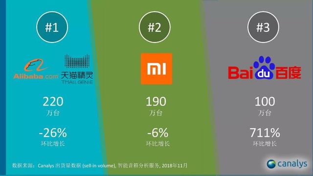 StrategyAnalytics发布的报告显示,三季度阿里巴巴出货量220万,仅次于亚马逊和谷歌,百度、小米出货量均为190万台,市场份额占比8.4%,并列第四,超过苹果;Canalys报告显示,三季度百度智能音箱出货量达100万台,环比增长超过711%,进入市场前三,阿里、小米和百度合计出货量为510万台,市场份额高达88%。