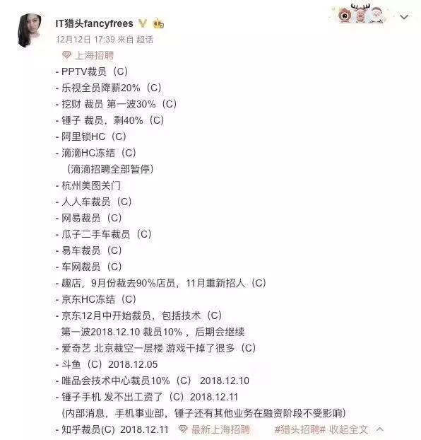 回顾过去不到一个月的时间里,爆出裁员的互联网公司有多少?京东裁、去哪儿裁、知乎裁、美团裁、微博裁、锤子倒……当然以上所有消息都被官方辟谣,但……你懂的。