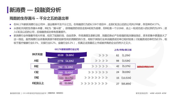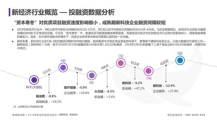 公认的资本寒冬之下,鲸准研究院透过数据分析发现:以新科技、医疗健康、文娱消费、新金融等为代表的新经济行业,融资速度受环境影响极小,B轮之前平均各轮次融资间隔约为520天,C轮以后约为415天,与2015-2017年的平均水平相比,波动率不足4%,相比之下,具备穿越周期的硬实力。