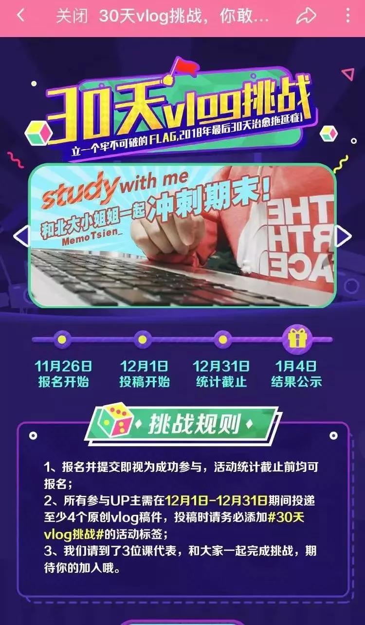 今年初,各大平台纷纷将注意力转向Vlog。9月18日,微博Vlog官方发出Vlog召集令,30天内发布过4条以上Vlog,就有资格申请微博认证的“Vlogger”,享受相关的社区优惠扶持。11月,B站发布30天Vlog挑战,完成挑战的UP主同样可以得到一系列奖励。