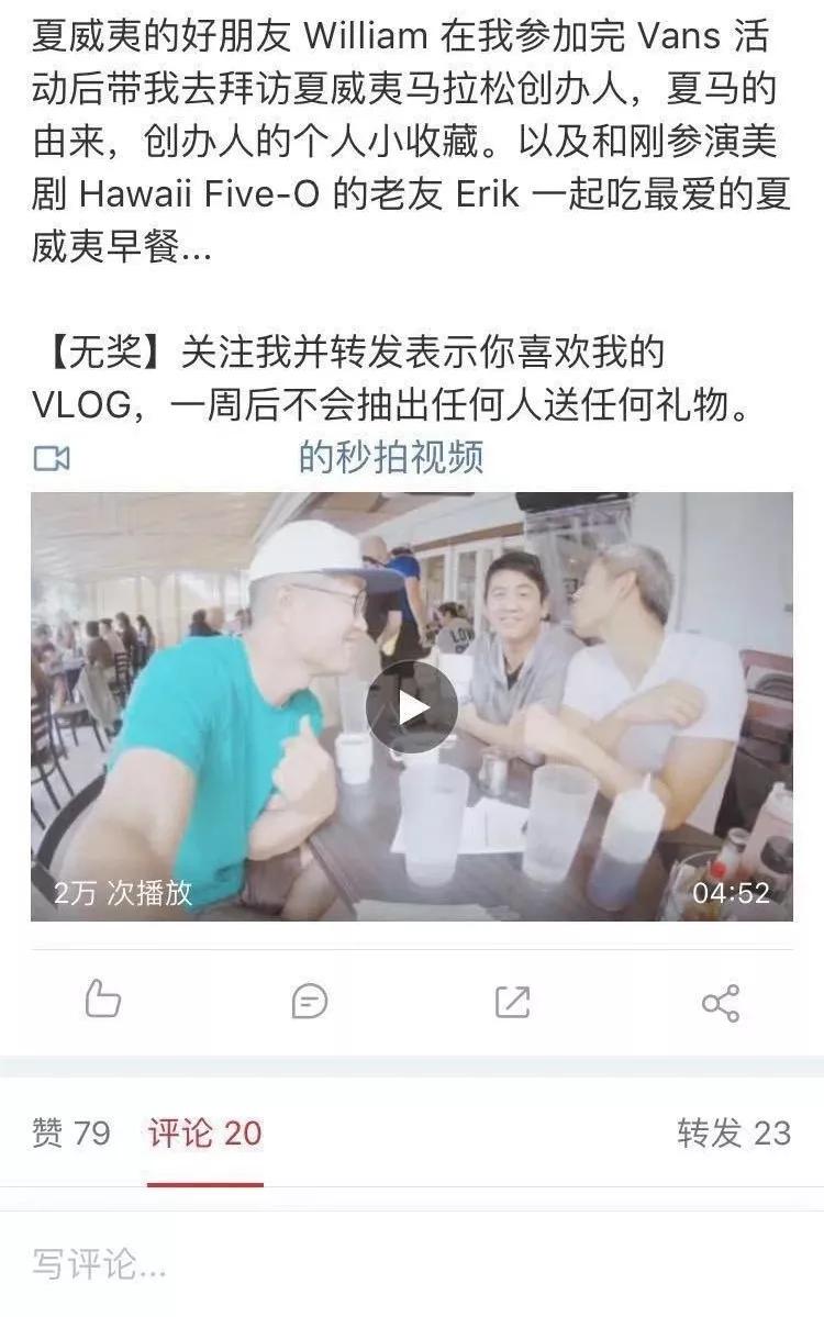 下图来自某位微博近10万粉丝的Vlogger,平时他含抽奖的Vlog可以获得400次以上转发。而在最新一条Vlog中,他宣布不再抽奖,只写了“关注我并转发表示你喜欢我的VLOG”。