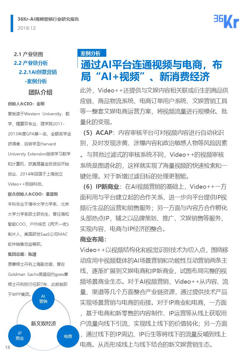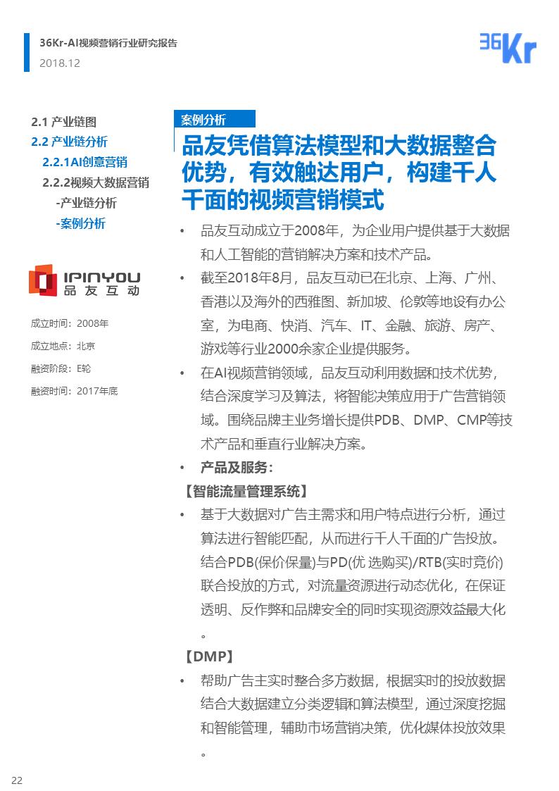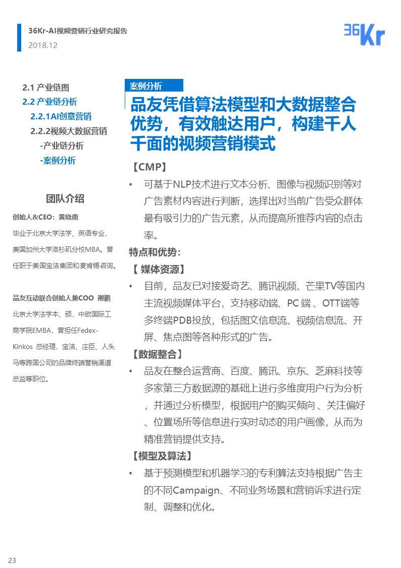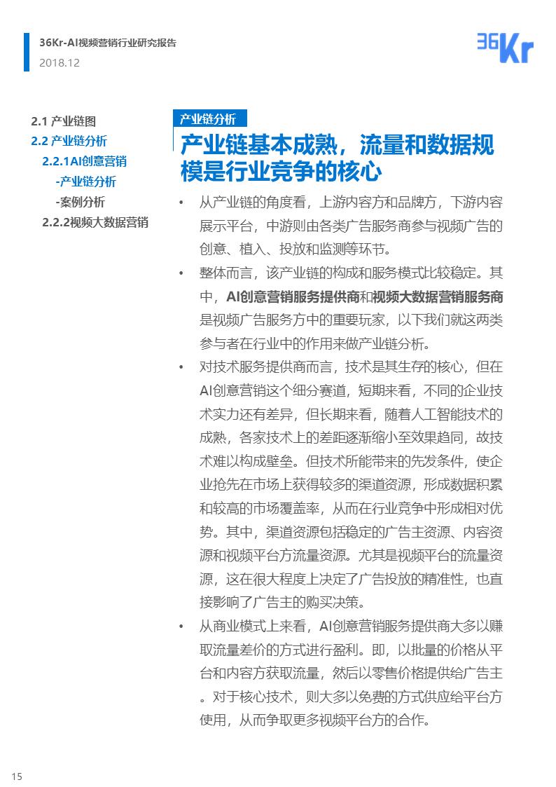 整体而言,该产业链的构成和服务模式比较稳定。其中,AI创意营销服务提供商和视频大数据营销服务商是视频广告服务方中的重要玩家,以下我们就这两类参与者在行业中的作用来做产业链分析。