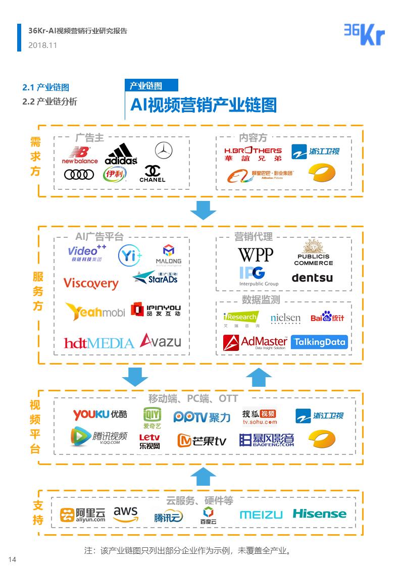 从产业链的角度看,上游内容方和品牌方,下游内容展示平台,中游则由各类广告服务商参与视频广告的创意、植入、投放和监测等环节。