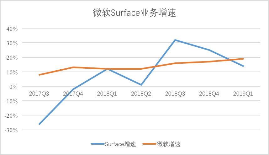 2017财年Q3(对应自然年2017年Q1)微软将Surface营收纳入财报。2017年(2017财年Q3开始的四个季度),Surface营收增速均弱于微软整体水平,其中两个季度录得负增长。今年前三季度全都大幅增长,其中两个季度增速高于微软整体水平。