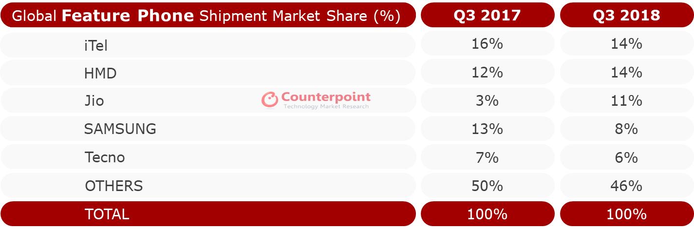 该公司旗下拥有TECNO、itel、Infinix等品牌,其中TECNO、iTel都是功能机前五品牌。Counterpoint数据显示,今年三季度,仅TECNO、itel两大品牌就占据了功能机市场20%的份额。