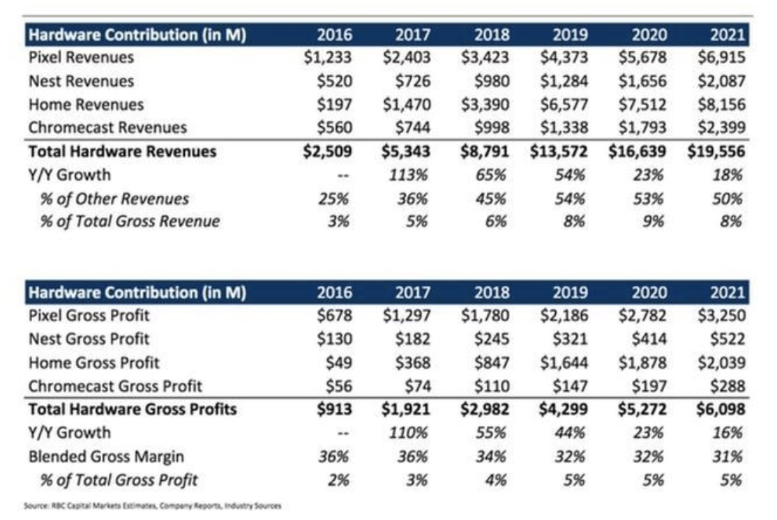 日前,加拿大皇家银行(RBC)表示,谷歌最近在硬件方面(包括智能音箱以及Pixel手机)的成功,将带来收入和利润的增长。RBC预计,到2018年,硬件部门将总共产生88亿美元的收入(占总收入的6%)和30亿美元的利润(占毛利润的4%)。到2021年,将上升到196亿美元(占总收入的8%)和61亿美元(占利润的5%)。