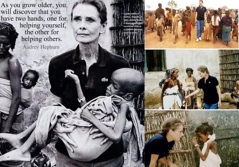 1988年,奥黛丽·赫本出任联合国儿童基金会的爱心大使。她的足迹遍布拉丁美洲和非洲等贫困战乱国家,她挺身而出为全世界弱小无助的儿童呐喊、呼吁和募捐,让全世界很多人留下热泪。