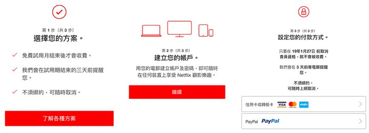 Netflix 的注册流程相对简单,基本就是输入注册用的电子邮箱、设定密码和输入支付信息。支付方面,Netflix 支持 VISA、MasterCard 等外币卡,如果没有,可选择先注册一个 PayPal 账户并绑定银联卡支付。