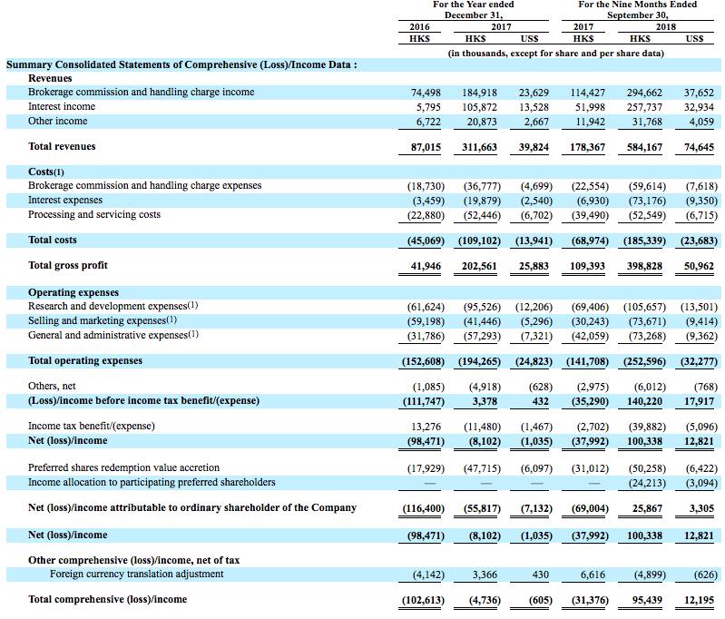 招股书披露,2018年前9个月,富途证券总营收为5.842亿港元(约合7460万美元),高于上年的1.784亿港元。其中,经纪佣金和手续费收入为2.947亿港元(约合3770万美元),高于上年的1.144亿港元,占比50%;利息收入为2.577亿港元(约合3290万美元),高于上年的5200万港元,占比44.1%;其他收入为3180万港元(约合410万美元),高于上年的1190万港元,占比5.4%。