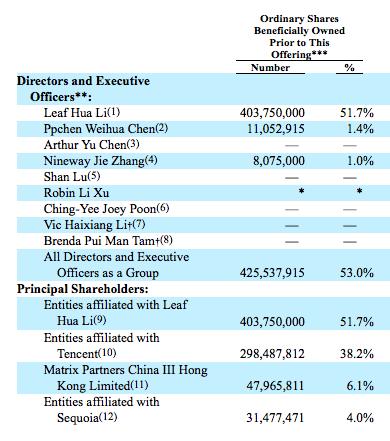 招股书显示,公司创始人、首席执行官兼董事会主席李华持有403,750,000股普通股,占总股本的51.7%,为最大股东;腾讯持有298,487,812股普通股,占总股本的38.2%,为第二大股东;经纬中国持有47,965,811股普通股,占总股本的6.1%,为第三大股东;红杉资本持有31,477,471股普通股,占总股本的4.0%,为第四大股东。