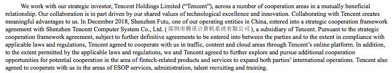 招股书披露,富途证券与腾讯在多个领域建立密切关系,与腾讯的合作为富途创造了有意义的优势。2018年12月,富途与腾讯达成战略合作框架协议,腾讯通过其在线平台为富途提供更多战略支持。
