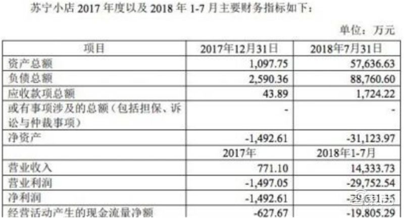 2017年,苏宁易购宣布要在2018年新开小店1500家。截至今年7月31日,苏宁小店已在全国开设878家门店。但是根据公开资料,苏宁小店2017年营业收入771.1万,净亏损1492.61万;2018年1-7月营业收入1.4亿,净亏损2.96亿。
