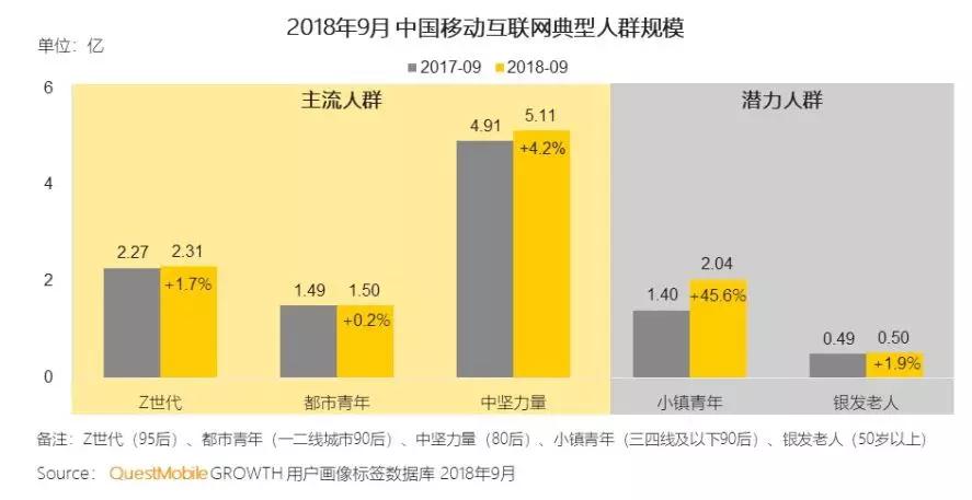 内容消费端,「五环外」用户,也正在靠拢主场。QuestMobile秋季报告显示,2018年9月中国移动互联网人群中,90后小镇青年用户规模上升45.6%。相较之下,都市青年仅上升了0.2%。
