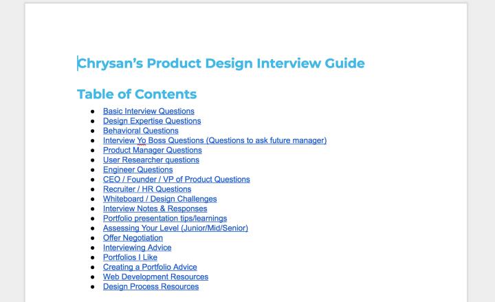 最开始准备面试时,我觉得非常受挫。因为我没有用户体验或产品设计相关岗位面试的资源法宝。拿其他岗位来说,就有很多手到拿来的求职秘籍。工程师岗位有《程序员面试宝典》(Cracking the Coding Interview),咨询顾问岗位有《发现工作力:决定面试成败的22个实战案例》(Case in Point),但产品设计岗位却没有类似的宝典。于是,我决定根据自己的面试经历,自己通过谷歌文档整理一份宝典。