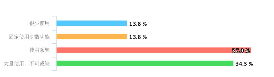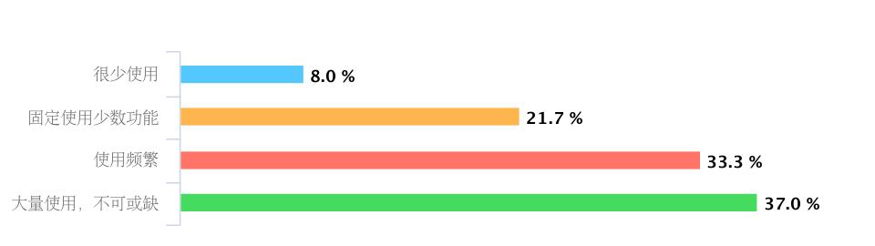 最后一组问题是有关使用深度,我用了四个主观感受语句来切分。结果显示超过70%的用户都已经在频繁使用,甚至大量使用,不可或缺。