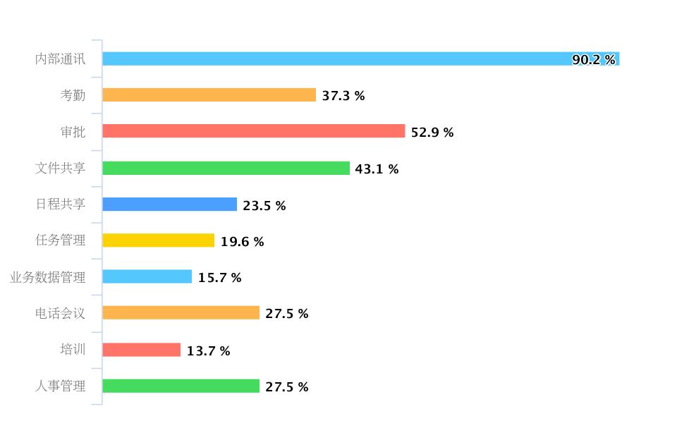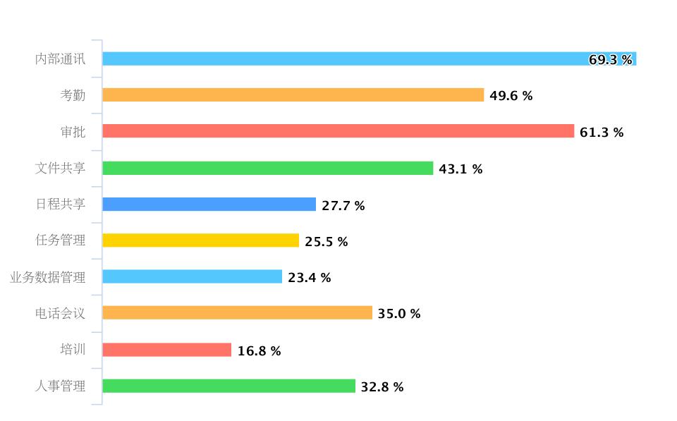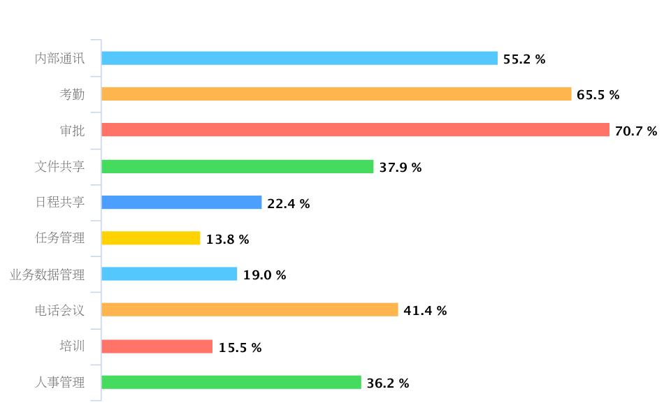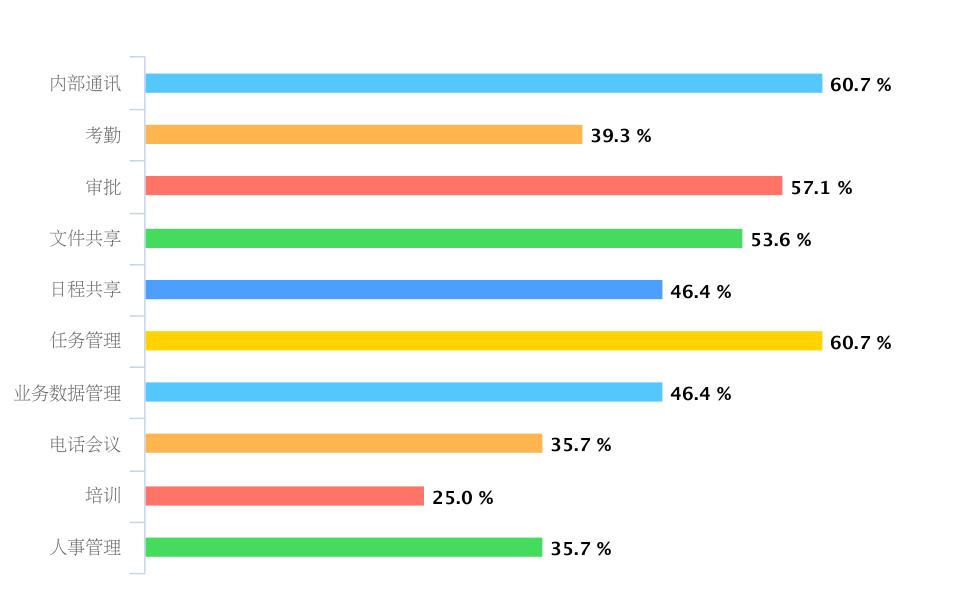 图表显示的用途分布显然比钉钉和企业微信要均匀得多,而且任务管理和内部通讯并列第一。业务数据管理也占到46.4%。可以猜测,他们要么是用了类似钉钉或企业微信的其他付费产品,也可能独立使用各种垂直系统。