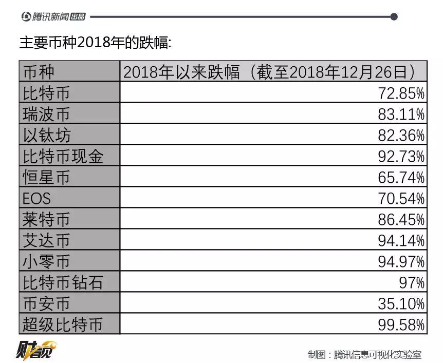 据腾讯《深网》统计,2018以来,瑞波币跌幅为83.11%,以太坊跌幅82.36%,比特币现金跌幅92.73%,莱特币跌幅86.45% 。