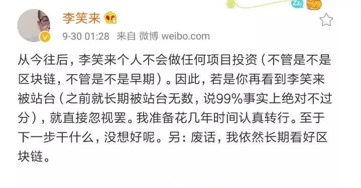 2018年7月,李笑来一段戏谑区块链投资者的录音被曝光,之后,李笑来立马写了《韭菜的自我修养》为自己澄清。2018年9月30日,李笑来又通过微博表示,今后他个人不再做任何项目投资(不管是不是区块链,不管是不是早期),并准备花几年的时间认真准备转行。64天后,李笑来摇身一变,做起了雄岸科技的执行董事与联席CEO,专注区块链投资。