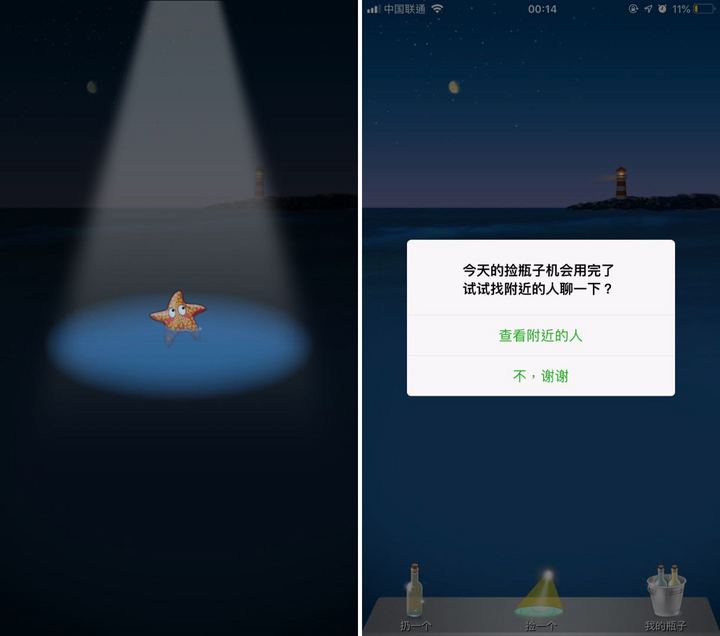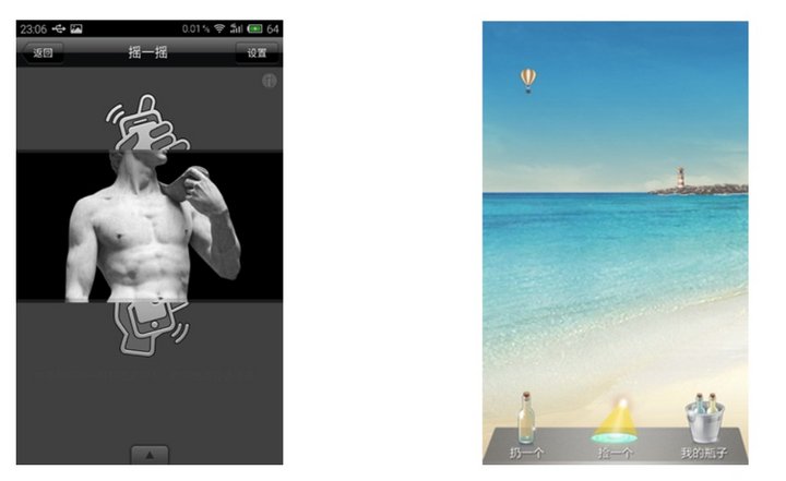 ▲ 左边为摇一摇开始的界面,右边为漂流瓶界面