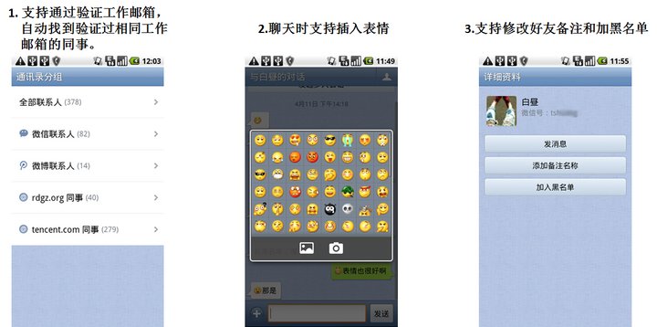 接着增加的功能有:支持多人会话、支持通讯录和会话搜索、腾讯微博私信互通等。