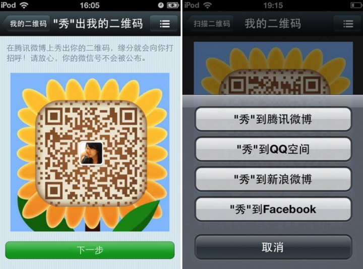 在 3.5 这个版本中,新增了扫描二维码、二维码名片的功能。