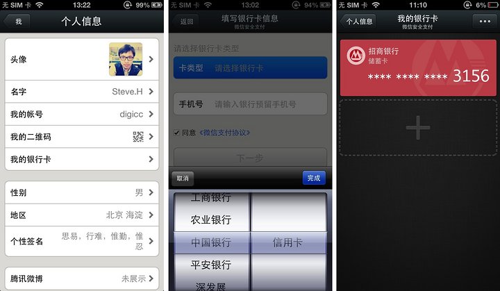 「微信支付」功能,打通了线上线下,可以把微信号和银行账号绑定。