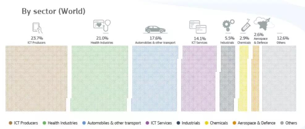整体看,美国上榜778家公司(投资额占比37%),欧盟577家公司(27%),日本339家(13.6%),中国438家(9.7%%),剩下12%则由世界其他地区的368家公司构成(其中,韩国和瑞士又分别各自贡献了4%)。
