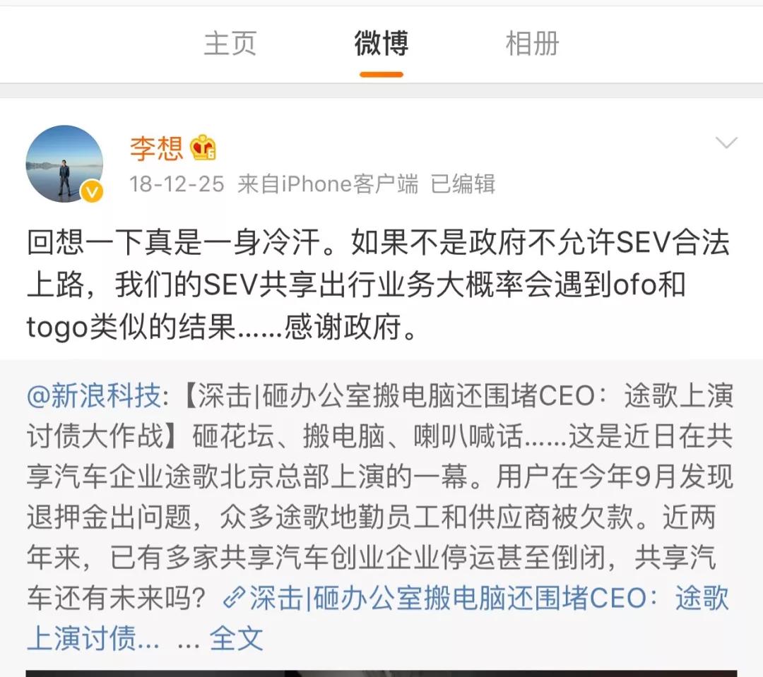 共享汽车进入寒冬的另一大原因还有政策因素。目前国内还没有完善的政策为共享汽车的大发展做背书,也缺乏相关的监管机制。这导致共享汽车乱停车、车辆频繁被破坏等乱象丛生。难怪在途歌爆发“押金门”事件时,车和家CEO李想在微博感慨道:“回想一下真是一身冷汗,如果不是政府不允许SEV合法上路,我们的SEV共享出行业务大概率会遇到OFO和途歌类似的结果,感谢政府。”这不难看出共享汽车市场太需要政府部门的大力扶持。