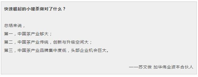 苏文俊:加华伟业资本主要是做后期投资的,小罐茶是唯一一个有创业想法时我们就想投的企业。今天,我们与小罐茶CFO王总切磋一下小罐茶的成功之道。