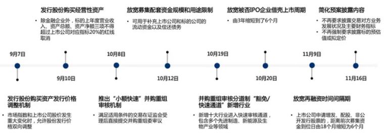 并购重组监管在经历了2014-2015年间的宽松,再至2016-2017年间的收紧之后,2018年三季度起,再次迎来宽松周期。从审核速度、可并购资产和方向、模糊地带监管和创新方案设计、信息披露四大层面对并购重组和再融资政策进行松绑,利好不断。