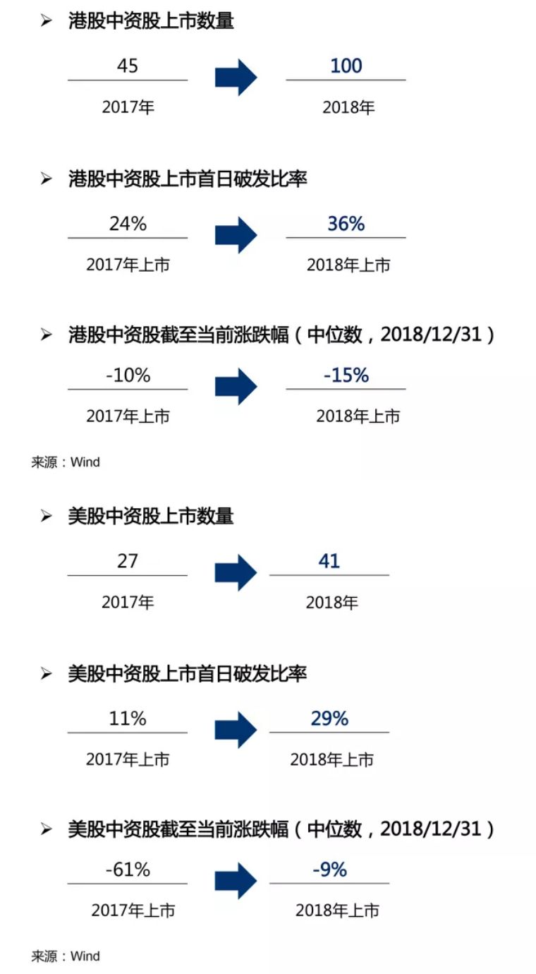 中概股看似盛世的背后,却面临着日益常态化的“破发”窘境:2018年上市的中资股在港美市场的破发率分别达到37%和24%,上市后股价又遭大幅下挫,可见市场资金目前对新股的投资已是十分谨慎,港股IPO在2018年甚至出现了没有基石投资人的情况。此后,公募基金对于接手IPO将会更加趋于避险,2019年后续美股和港股IPO势必会受到更多挑战。