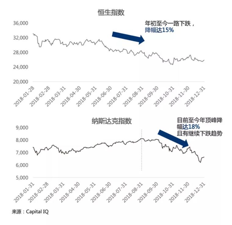 海外资本市场进入下行通道,或将迎来熊市:恒生指数在多年稳定上涨之后,2018年下跌近15%;纳斯达克指数也在2018年9月开始出现回落,距2018年顶峰降幅达19%。中国企业未来海外上市估值的不确定性进一步增加。