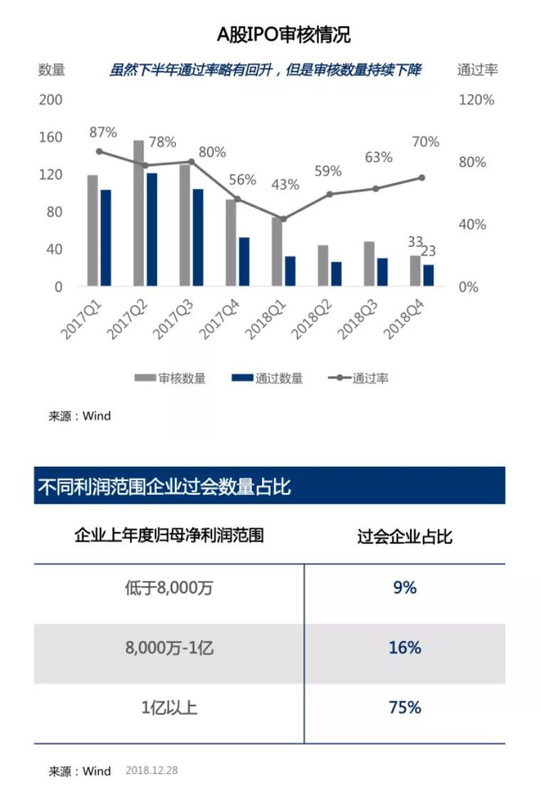 2018年A股IPO数量出现了大幅度下滑,全年首发过会企业仅111家,较去年下降71%。2018年全年上会企业共计199家 ,整体过会率仅56%,较去年大幅下跌20%。A股市场始终强调利润背书,2018年审核的利润红线尤为明显:超过75%的过会企业上年度审计的归母净利润超过1亿元。在当前A股的发行制度下,机构退出周期长、难度大、不确定性高。大部分企业,尤其是新经济企业,无法依靠A股IPO实现退出。