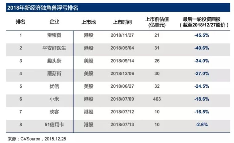 对于寻求IPO退出通道的投资机构来说,未来回报空间也遭到大幅压缩:2018年已有不少新经济独角兽在二级市场表现惨淡,导致最后一轮进入的投资机构不得不面临浮亏的窘境。IPO是否还是新经济企业的最优资本路径或需重新评估。