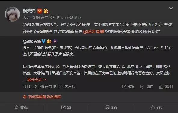对此,刘杀鸡的回应也是颇为泰然,一方面感谢了老东家的栽培,一方面表示新东家虎牙直播会为自己提供法律援助以及所有赔偿。