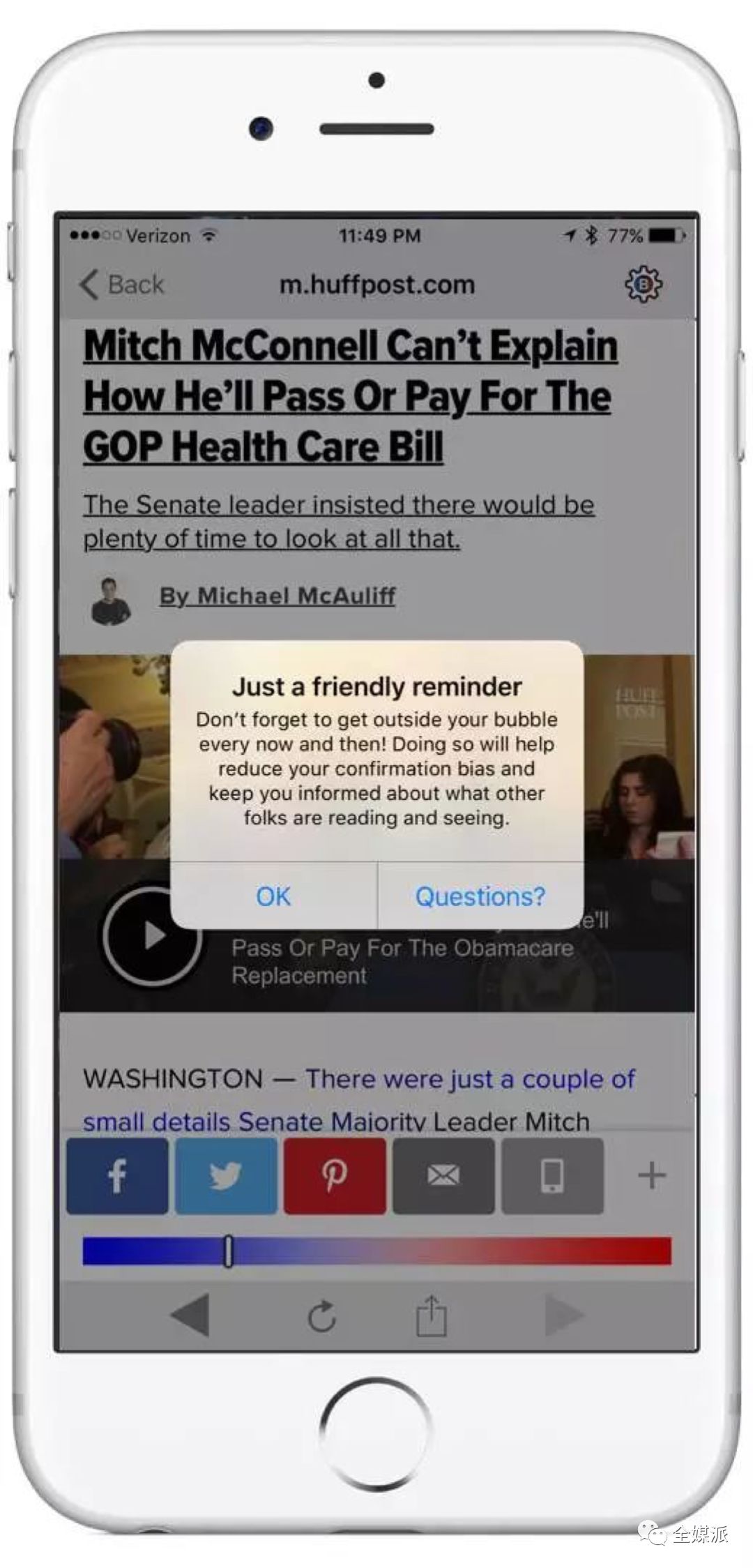 一款新闻app站出来宣战。“Read Across the Aisle(简称RAA)”希望能帮助用户把新闻选择习惯变得多元化,于是他们打造了一组“意识形态波谱”,根据媒体自带政治倾向,将《赫芬顿邮报》设为最左,福克斯新闻设为最右,中间包括了诸如《纽约客》、NPR(国家公共电台)、《基督教科学箴言报》等20家新闻媒体,通过这些媒体的属性来追踪和定位用户的阅读习惯。