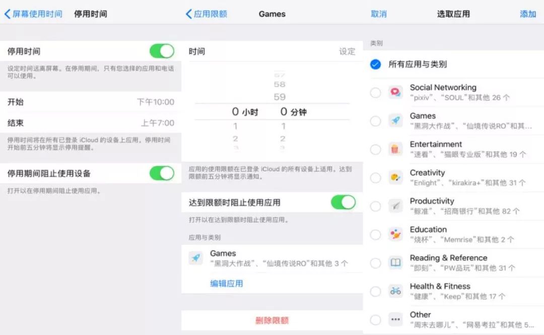 通过量化图表来直观地提醒用户自我改正,当你看见自己一天有6小时都在娱乐时,可能会产生些许愧疚感而收敛自己的沉迷程度。除此之外还有强制力稍强一点的功能——“应用限额”和“停用时间”,用户可以自己设定某一时间段无法打开手机或手机里的应用程序。